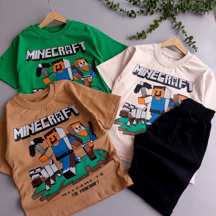 تیشرت شلوارک مانکرافت پارچه پنبه لاکرادار سایز 45 الی 60 مناسب برای 5 الی 12 سال در سه رنگ سبز کرمی و قهوهای