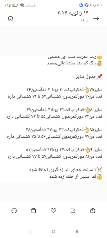 سایز ۸۵ قد کراپ کت ۴۳ پهنا ۴۱ قد آستین ۴۸ قددا من ۷۷ دور کمر بدون کشسانی ۵۶ تا ۷۵ کشسانی داره